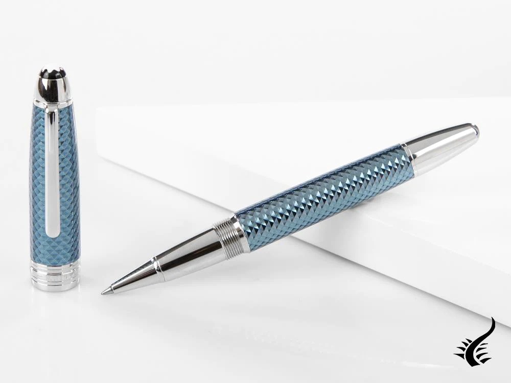 Inspiré des glaciers du Mont Blanc, le roller Meisterstück Glacier représente l’engagement de la maison pour des produits de qualité. Le capuchon et le corps spécialement gravés sont recouverts d’une laque bleue translucide qui représente les réfractions géométriques des cristaux de glace.
